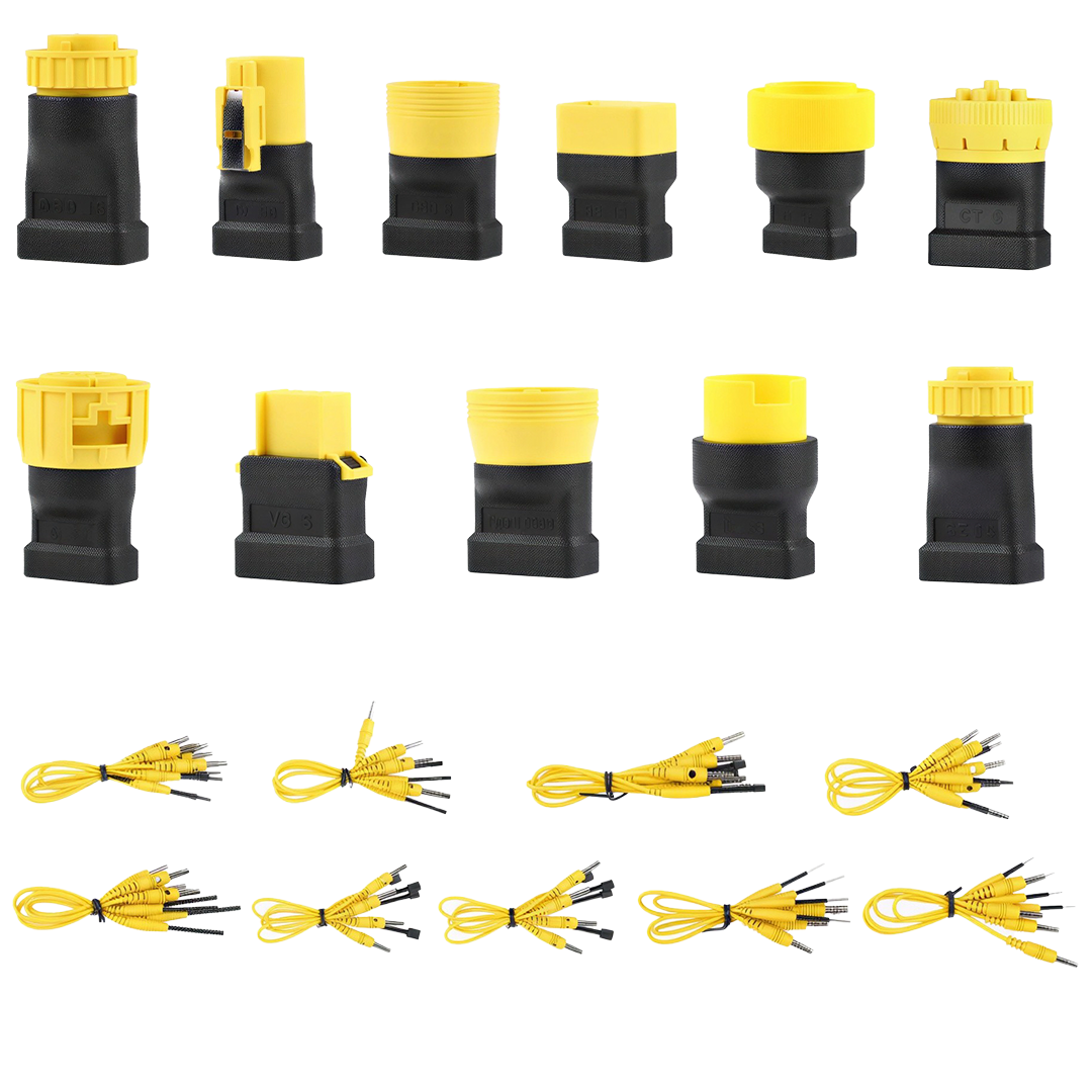Такой комплект переходников включает в себя все необходимые переходники и адаптеры для диагностики грузовых авто и строительной техники.