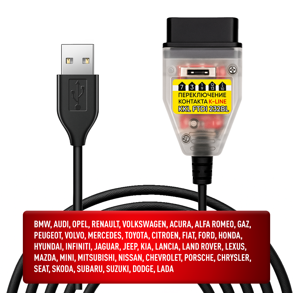 В качестве преобразователя USB-UART используется оригинальная микросхема FTDI FT232BL, которая является наиболее подходящей для старых автомобилей, особенно это кассается ВАЗ, ГАЗ, Daewoo, Nissan, Mitsubishi, Toyota, Ford, Honda, Kia, Hyundai.