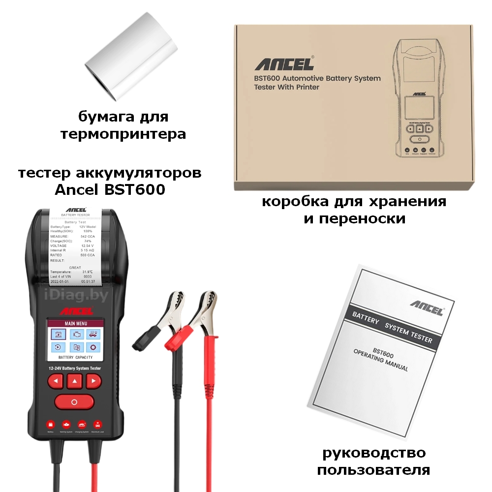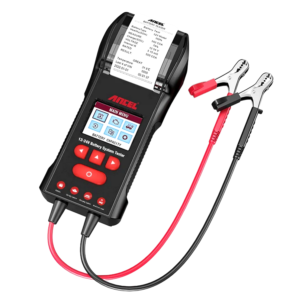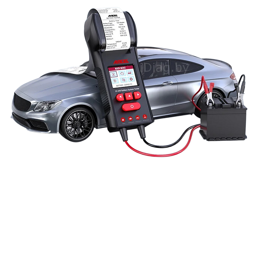 ANCEL BST600 — современный многофункциональный портативный тестер автомобильных аккумуляторов. Имеет встроенный дисплей и термопринтер для печати отчетов на 10 языках (включая русский язык).