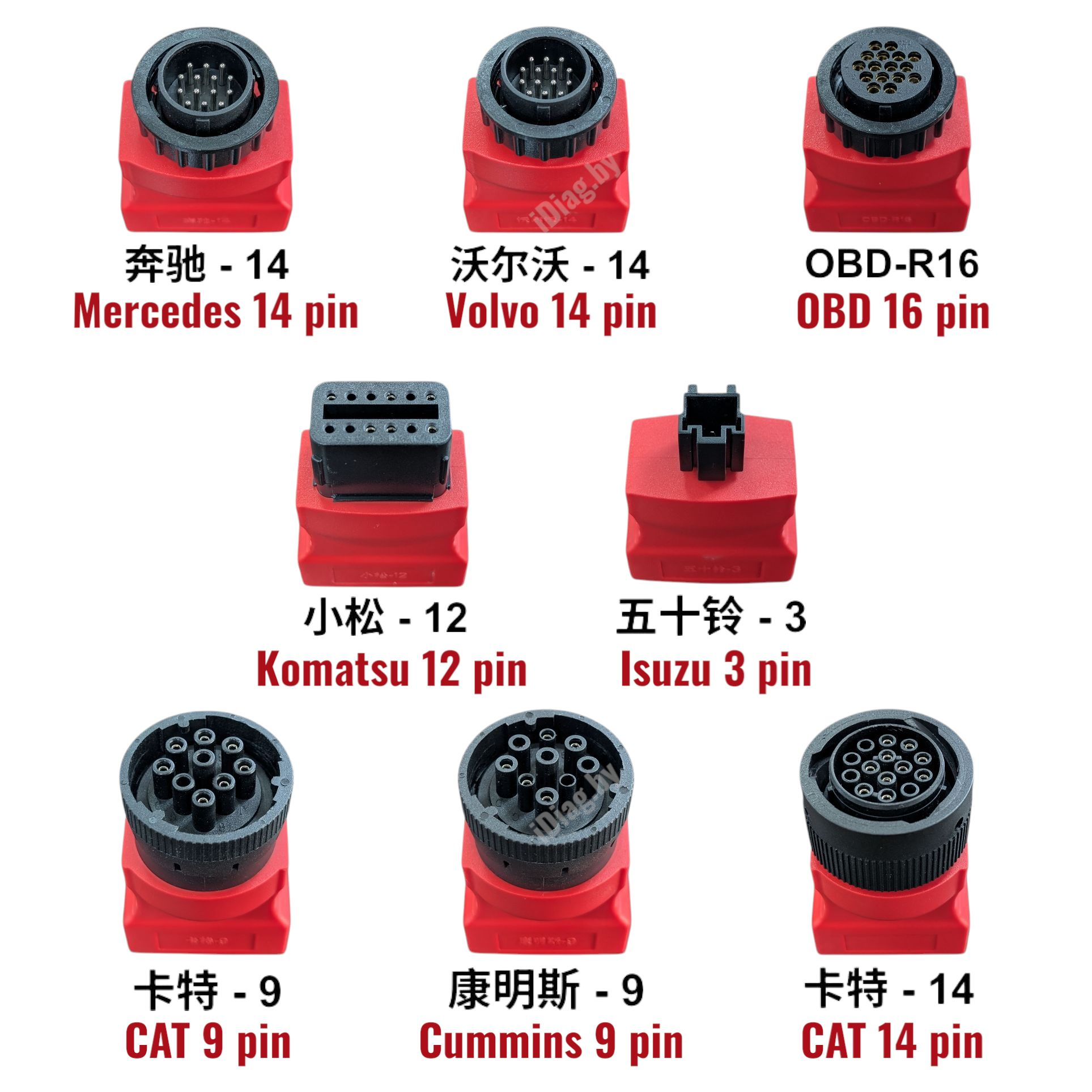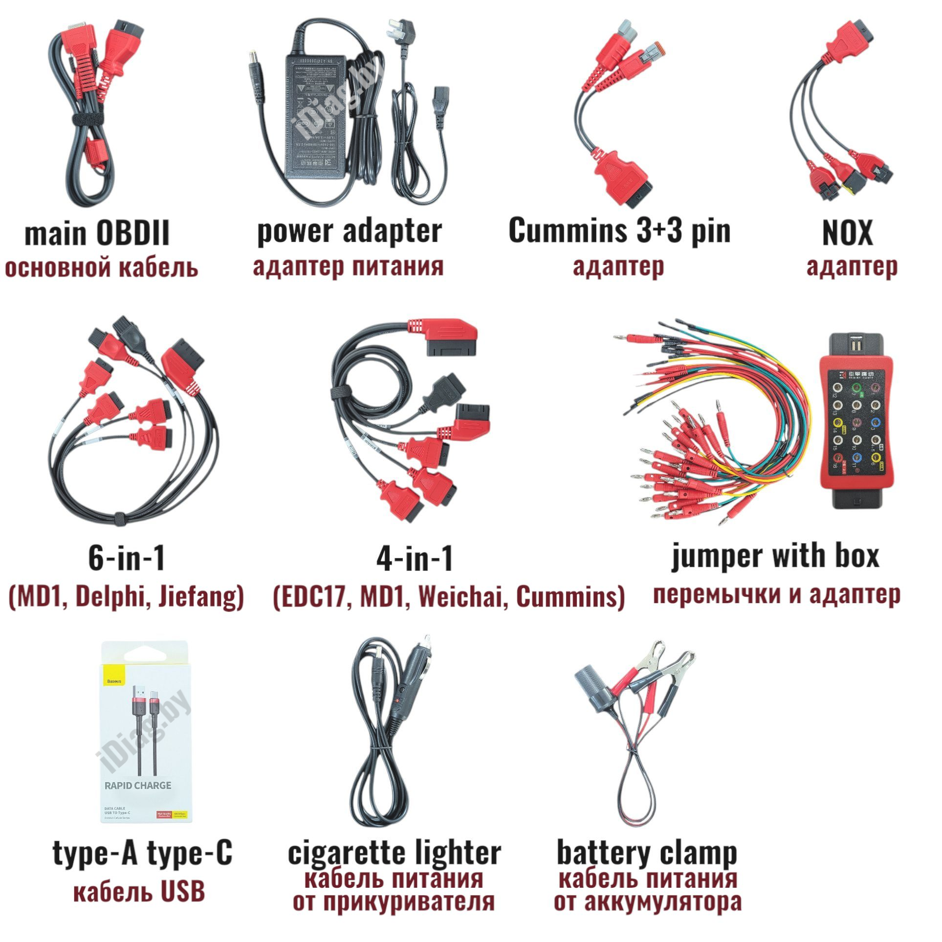 Комплект поставки: диагностический интерфейс X5 VCI diagnostic kit; руководство пользователя (на английском языке); гарантийный талон; лист комплектации (packing list); адаптер питания 220/15В 3А (тип разъема I CPCS-CCC); кабель питания от аккумулятора; кабель питания от прикуривателя; противоударный кейс для переноски и хранения; картонная упаковка для хранения; кабель USB Type-A - Type-C; основной кабель OBD2; перемычки для подключения по пинам (jumper wires); блок для подключения по пинам (breakout box / jumper wire box); адаптер 16 pin (OBD-R16); адаптер Cummins 9 pin (康明斯 - 9); адаптер Cummins 3+3 pin (康明斯 - 3); адаптер ISUZU 3 pin (五十铃 - 3); адаптер CAT 9 pin (卡特 - 9); адаптер CAT 14 pin (卡特 - 14); адаптер Mercedes 14 pin (奔驰 - 14); адаптер Volvo 14 pin (沃尔沃 - 14); адаптер Komatsu 12 pin (小松 - 12); адаптер NOX 4+4+5 pin (氮氧传感器); адаптер к ЭБУ двигателя (6 в 1) для: Bosch MD1 CS089; MD1 восьмигнездовой (тип 1); MD1 восьмигнездовой (тип 4); Delphi National VI 7.1AP; Delphi National VI 7.24; Jiefang National VI 36F; адаптер к ЭБУ двигателя (4 в 1) для: Bosch EDC17C55/63; Bosch EDC17C53/81; Bosch EDC17CV44/54; Bosch MD1CC878; Weichai 13A; Weichai 13E; Cummins CM2880.