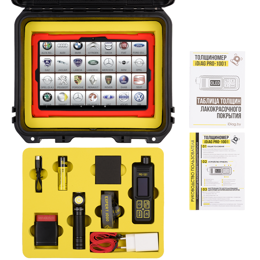 Всё необходимое собрано в одном комплекте, чтобы вы могли провести полную диагностику автомобиля в любых условиях — от толщины лакокрасочного покрытия до комплексной проверки электроники.