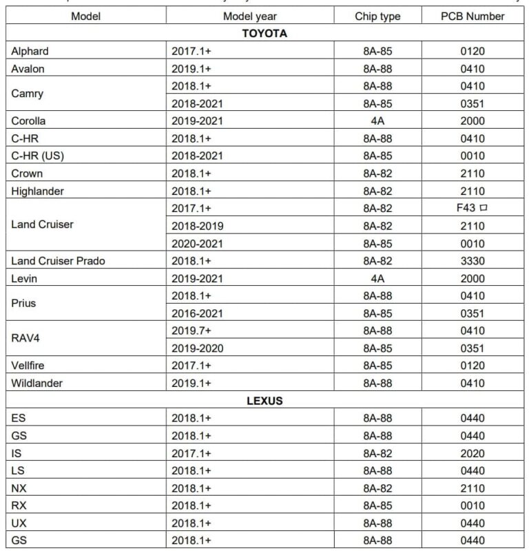 — совместим с моделями Toyota и Lexus с 2017 года и до новейших моделей, имеющих тип 8A (82, 85, 88) и 4A;