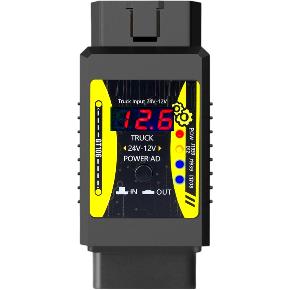 Преобразует напряжение 24 В в стабильные 12 В для безопасного подключения диагностического оборудования к грузовому и коммерческому транспорту через стандарт OBD-II.