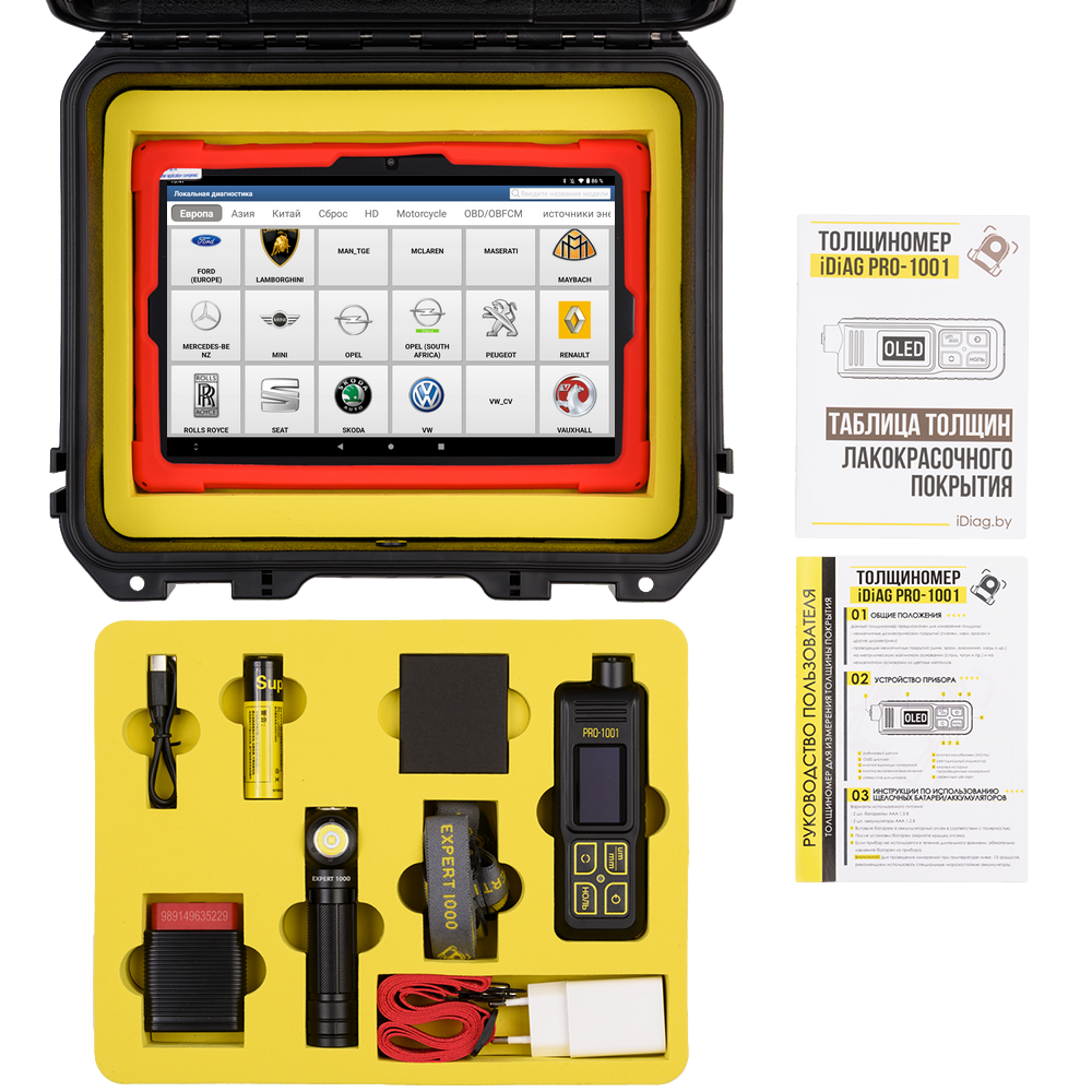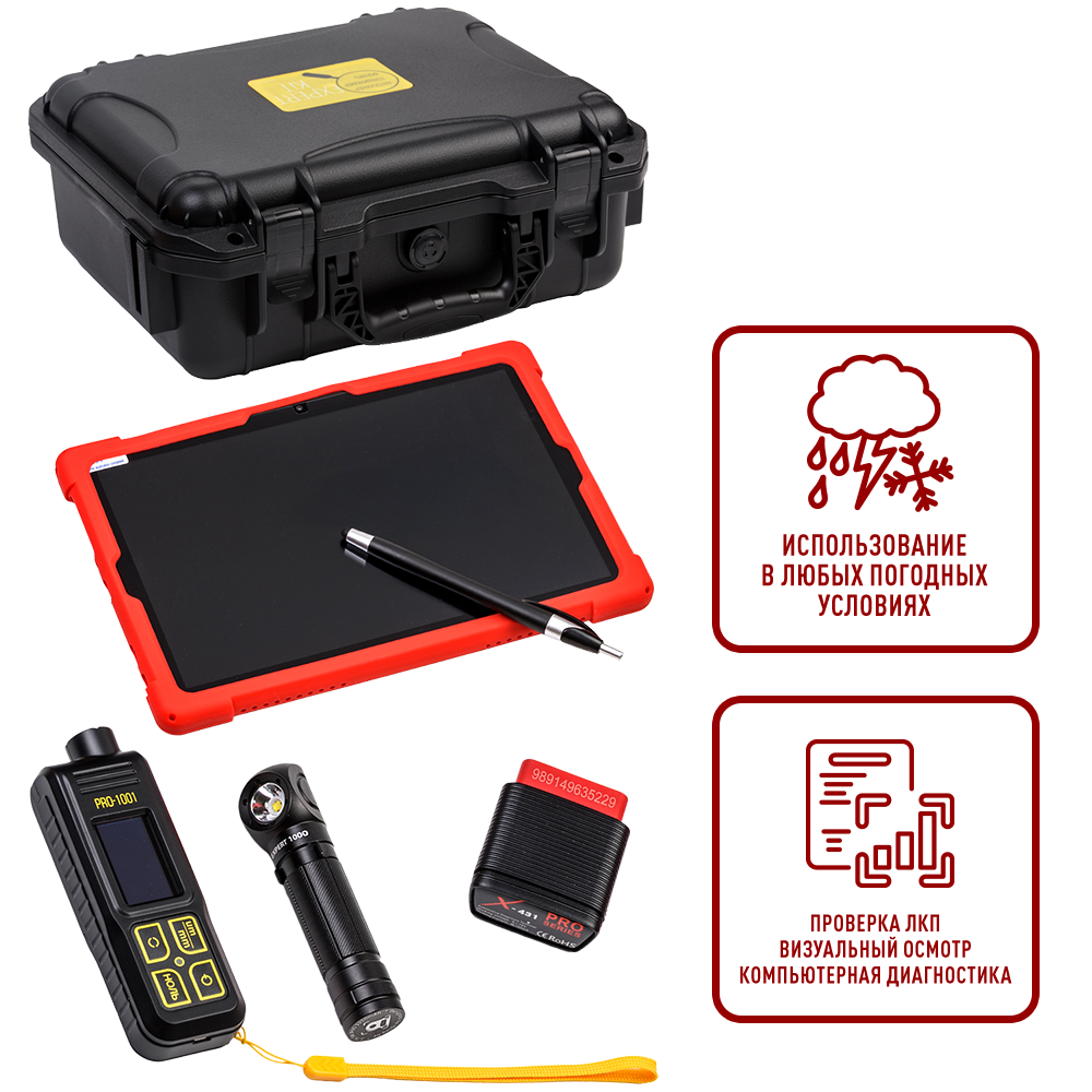 Всё необходимое собрано в одном комплекте, чтобы вы могли провести полную диагностику автомобиля в любых условиях — от толщины лакокрасочного покрытия до комплексной проверки электроники.