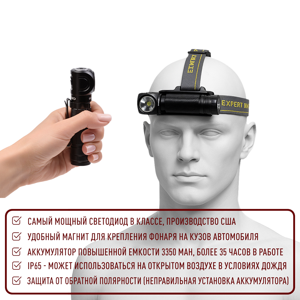 Фонарь EXPERT 1000 оснащен высокоэффективным светодиодом Cree XP-G3 (самый мощный светодиод в своем классе), который способен находиться в режиме работы (средний режим) до 35 часов.