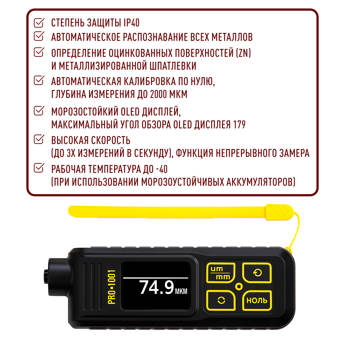 Глубина измерения до 2000 микрон, высокая точность и скорость измерения, морозостойкий OLED дисплей, степень защиты IP40. Допустимая погрешность измерений 2% ±2 мкм.